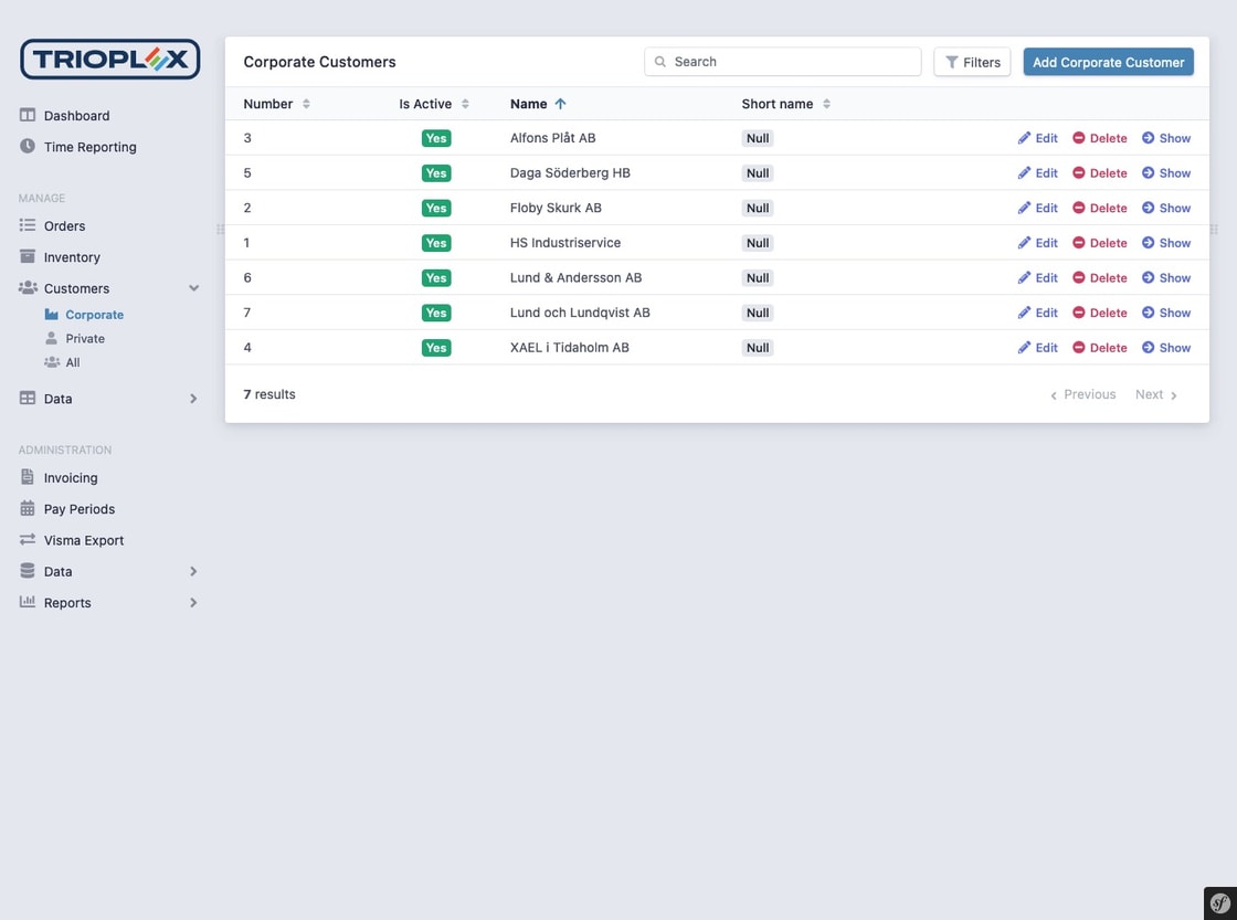 After this, we added a module for employees to report their work hours for simple salary reporting. This data was also combined with the hours logged on worksheets to give a week-by-week overview of the rate of the employees' billable hours. This was useful in two ways; as an accurate and timely indicator of what the order flow looked like, and for making decisions about approving overtime work.